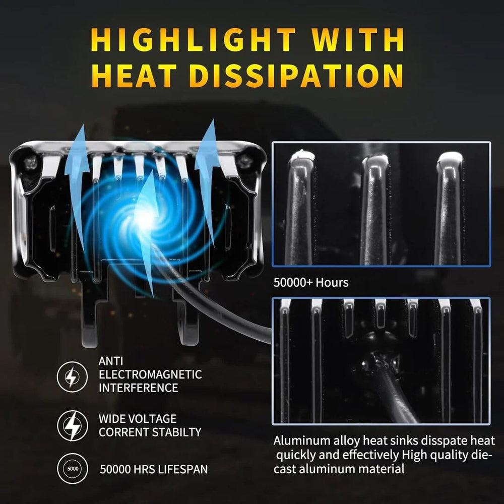 | Dual Color (White & Yellow) | Versatile Visibility: Provides a sharp 6000K White Beam for regular driving and a powerful 3000K Yellow Fog Beam. Excellent projection effect in snowy, rainy, foggy, and dusty weather. |